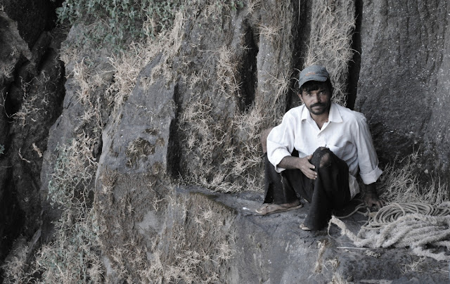 The descend: After a good breakfast of all that we had, right from Maggie noodles, parathas (or theplas for my fellow Gujarat friendsJ), biscuits & some black tea (kora chaha) as Nilesh had forgotten to bring milk powder, it was time to leave. Strapped our bags once again for the descend bidding a bye to the mountain top, we resumed our journey back to the base. Filling our bottles with the water from the tanks we stood on the same threatening patch of rock stars. Anyways, slowly & steadily once again at turtle speeds all of us managed to cross it & reach till the rock patch to rappel down. Another hour or so, the rappelling session continued as we chatted our way to glory. We came upon another group of three trekkers who’d come along with another villager as a guide. They stumbled upon the patch and watched upon us as we carried our activities with good ropes & harness whilst they’d come without any harness but with a hand made rope. When you see others equipped with proper things, you tend to doubt about your own things, & that’s what happened with the other group. They decided not to reach the top of the peak & rappel down with us. Completing the last rock patch for the trek we resumed our descend. The later trek was a simple walk through the dense plantation of thorny shrubs & rocks (once again we had to fight the thorns). Then started the singing session & the rest of us started correcting their vocal notes with every song they sang. Although they sang all together on different scales & notes, I and a few decided to stay back & follow in peace (I don’t like to disturb the peace of the jungleJ). Another two hours & we were crossing the farm lands on the base. Farmers dusted & sorted their crop produce while the goats grazed on the rest of the plantation. The sun was still shining bright in the sky & birds flying up high. We went through many farms to reach our village base.